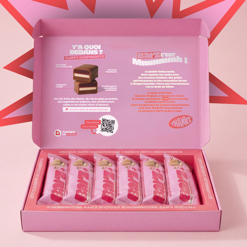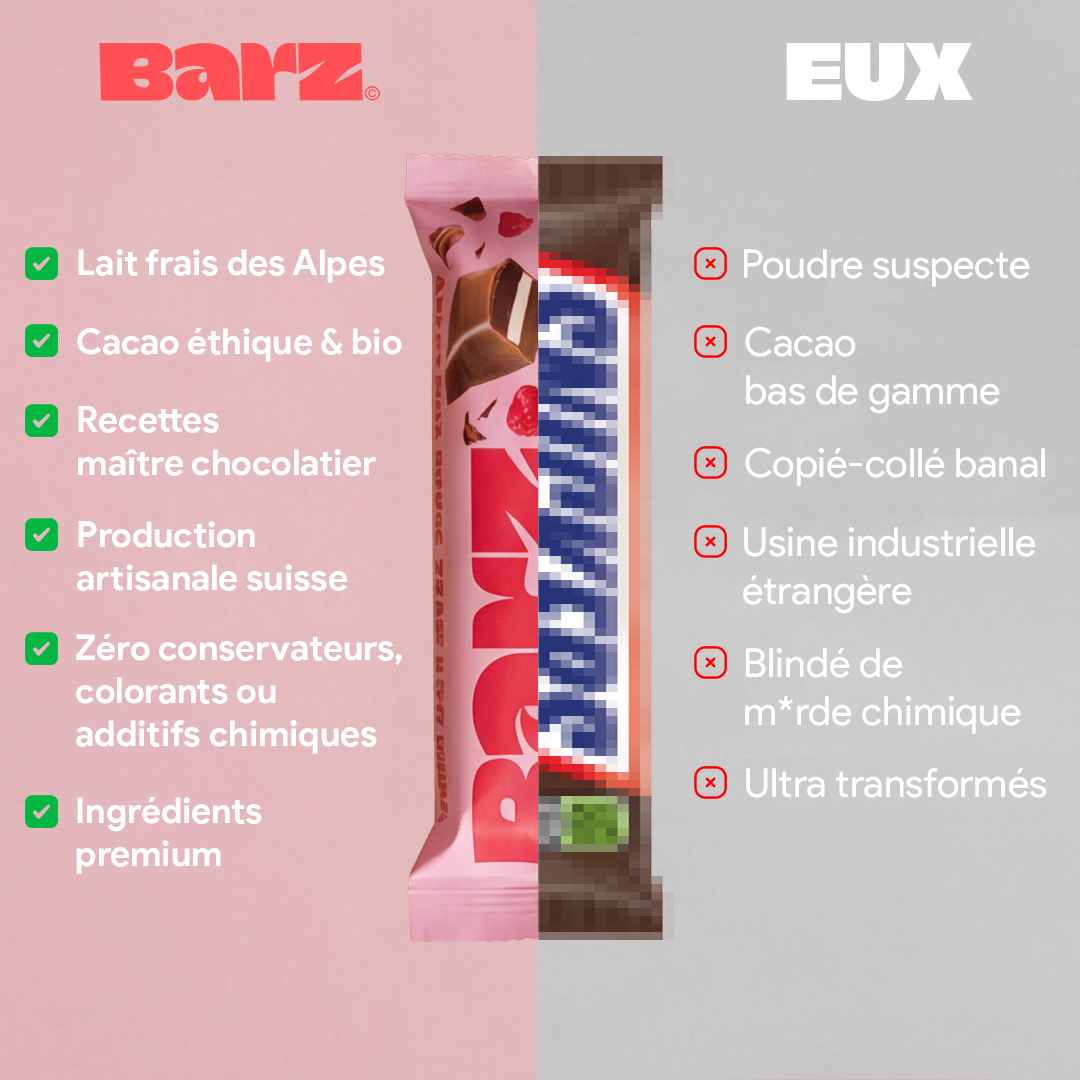 Barz, c’est une marque de barres chocolatées made in swiss ultra gourmandes, avec des recettes innovantes, des ingrédients choisis et zéro blabla inutile. On mise sur le goût, la qualité et le fun.